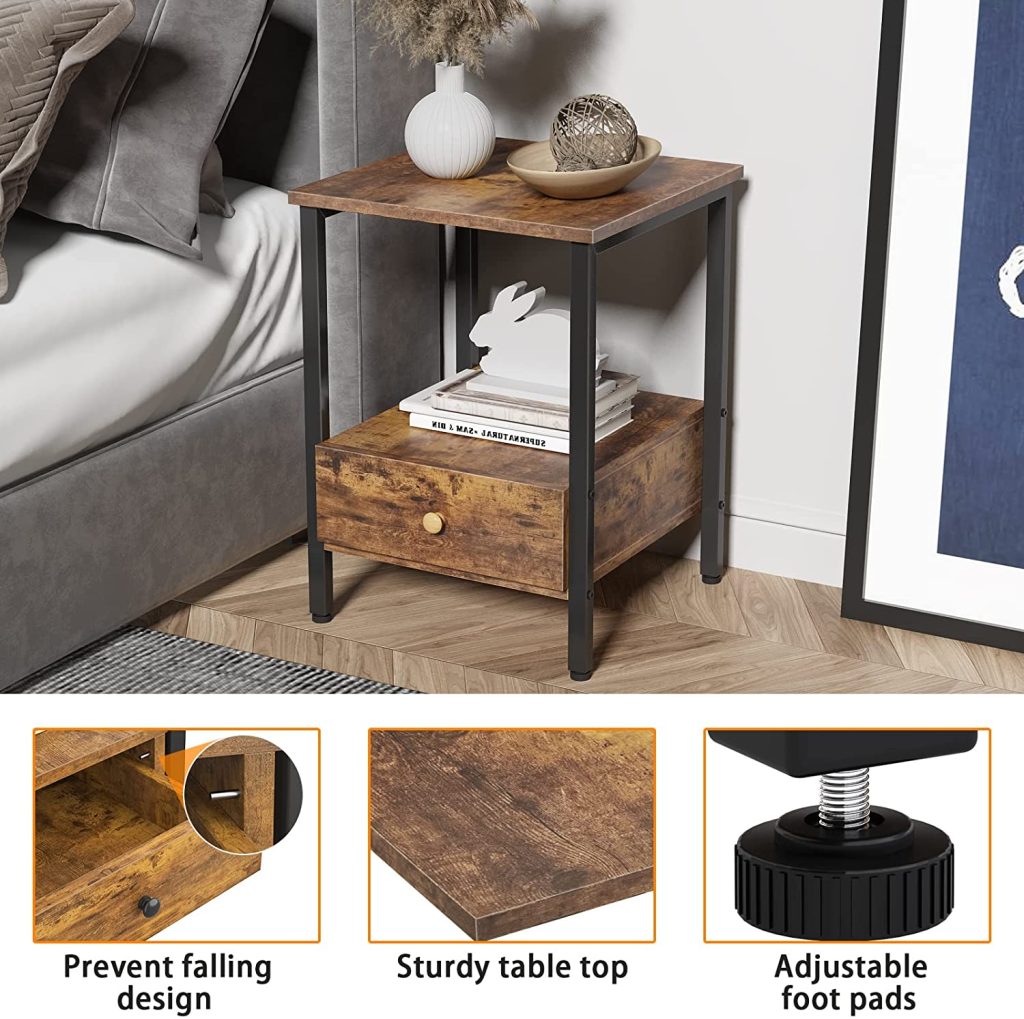 - Sturdy & Lasting Build: Elevate your space with our durable small night stand with drawer, crafted from robust metal frames and resilient MDF panels. Designed to offer unwavering support, this side table not only promises a lengthy lifespan but also simplicity in maintenance.