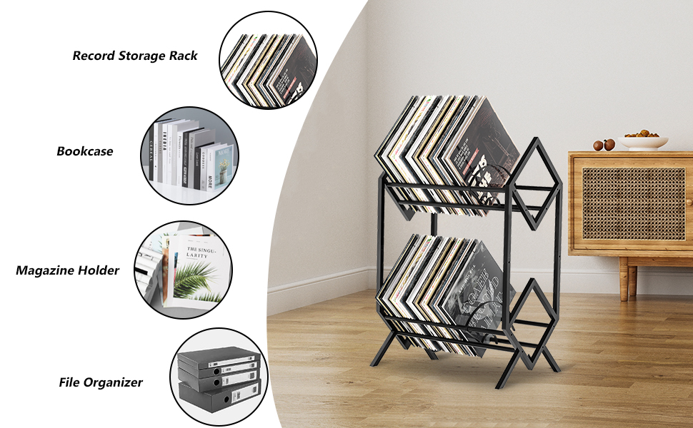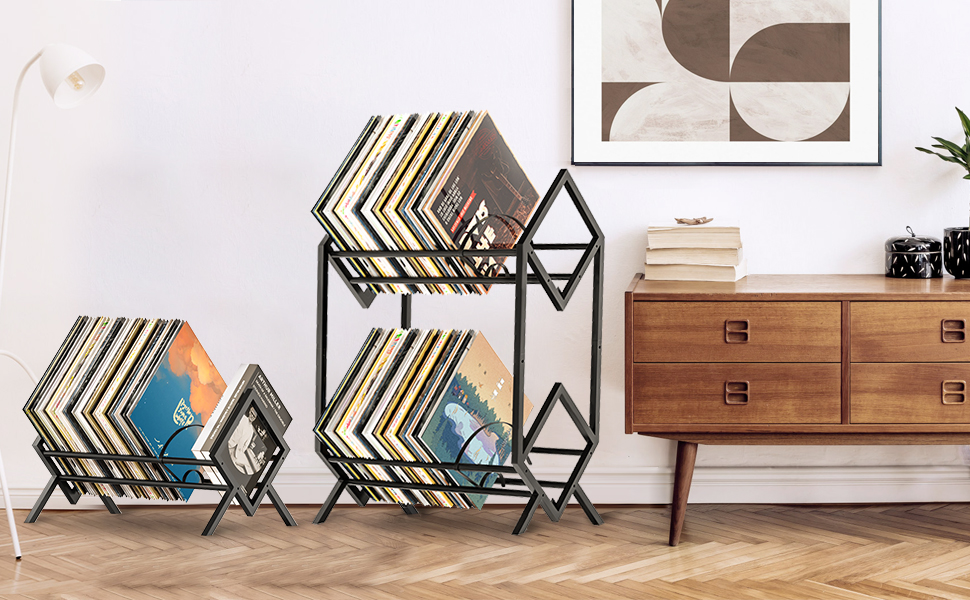 - Sturdy Construction:Vinyl record storage display shelf made of carbon steel, it is painted with high quality smooth powder coatings to protect your beloved records from scratches. Triangular structure make metal vinyl record holder stable and not easy to fall. The 45°tilt angle makes music records easy to store and find. No flipping through a crate to find a particular record.