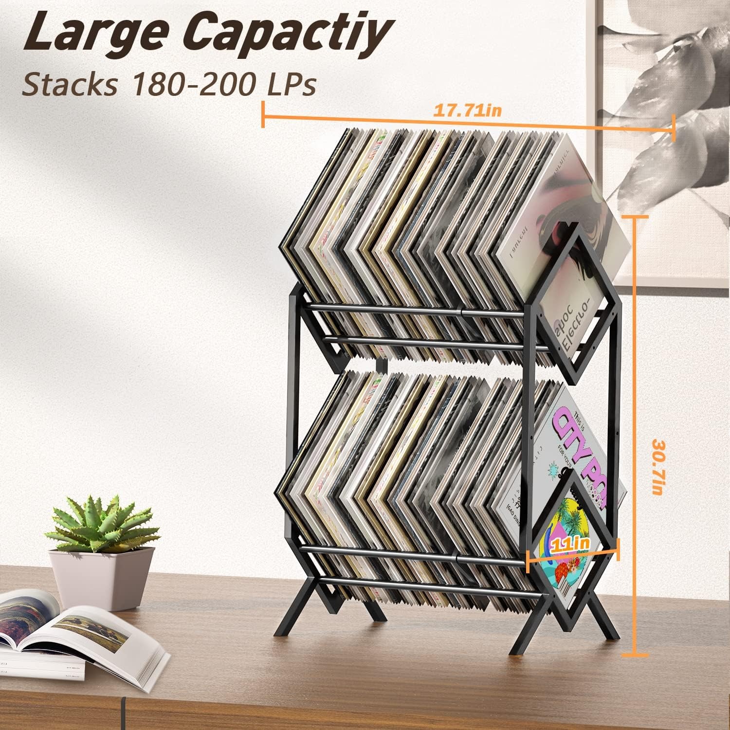 - Large Capacity Efficient Storage:Dimension of 2-tier vinyl record organizer shelf is 17.7*11*30.7 inch which can hold 180-200 LPs Albums in an organized and stylish manner. Y’all know how heavy vinyl albums can get and this bad-boy handles the load without a hitch.