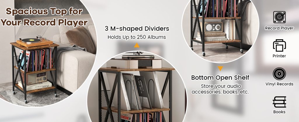 - [Ample Storage Space]: Including a large tabletop, 3 M-shaped dividers and an open compartment, this record player stand will provide a home for your daily items. You can arrange objects according to your preference, such as record players, albums, books, decorations and potted plants.